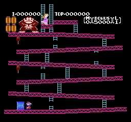 Наша задача - спасти принцессу, которую похитил огромная горилла Донки Конг. Перепрыгивая через бочки и избегая огня, безымянный герой, весьма похожий на Марио, должен добраться до самого верха. Это было первое использование в видеоиграх устоявшегося сценария "спасти девушку из беды", который позже стал шаблоном и фигурировал во множестве других компьютерных игр.