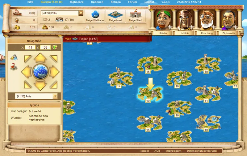 В начале игры вам дается небольшой участок земли, а точнее место под ваш город. Начинаете с того, что рождаетесь на острове с 9 такими же игроками как и вы. Весь игровой мир (Сервер) разбит на архипелаги, которые в свою очередь разбиты на острова.