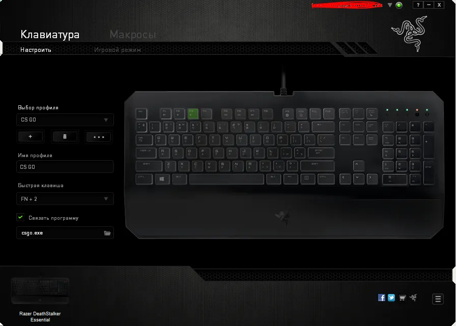 После чего программа обновляется до последней версии и начинает шуршать по всему компьютеру примерно несколько минут, видимо, создаёт профиль владельца на серверах АНБ, ФБР и ЦРУ. После чего мы видим на экране все найденные razer-устройства. В моём случае это, конечно, клавиатура. В суть самой программы вдаваться смысла нет, ведь она занимается всего двумя вещами: позволяет создавать макросы и умеет делать кое-что более интересное – назначать на любую клавишу клавиатуры практически любое действие (как вам "щелчок правой кнопкой мыши" вместо Esc?). Собственно, именно таким способом можно назначать макросы, создавая профиль для каждой игры. Я особо не экспериментировал, пока назначив лишь в CS: GO на F3 закупку сразу всех нужных мне гранат. Ситуация пародийная, ведь биндами, до появления этой клавиатуры я уже тоже самое проделывал в самой игре, правда заняло тогда это больше времени... существенно больше. Над возможностью записать макрос того, как я закупаюсь, бегу с базы и убиваю врагов, пока лишь задумывался. Но последствия подобной затеи рисуются забавные.