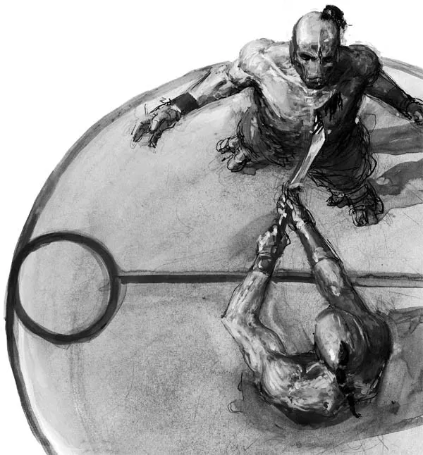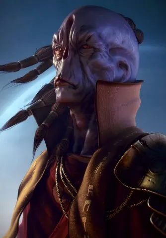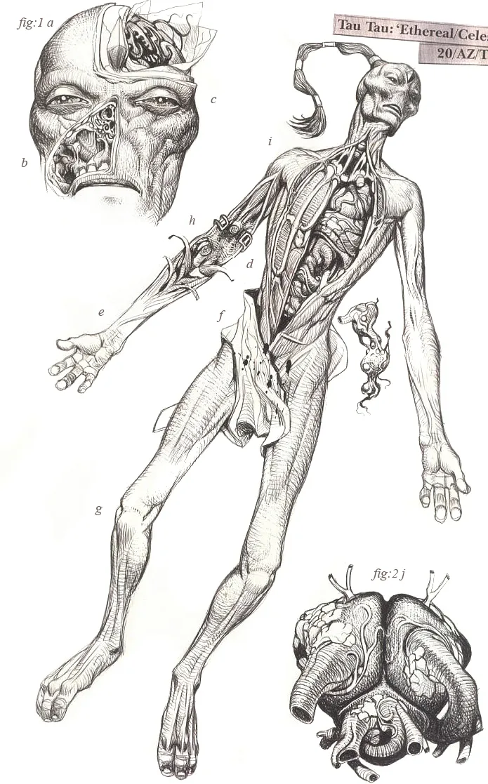 i) Кожный покров. В целом монотонный (серый, голубой) и безволосый. Высокая концентрация пористых конкреций говорит об эффективности процесса потоотделения (характерно для обитателей засушливых миров.) Вторичный слой содержит сложную систему трубчатых канавок, каппиляров и узлов желез.