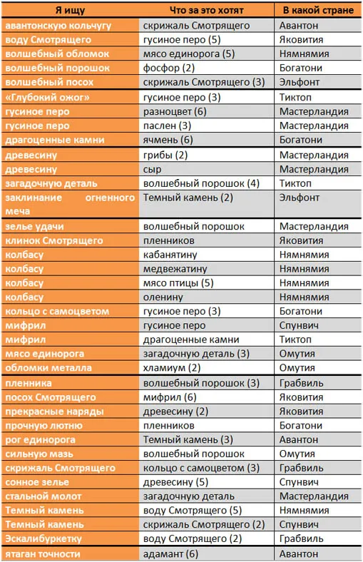 Быть может, у нас скопилось пачка какого-то конкретного товара, или открылся новый союз с новыми возможностями. Таблица 2 дает возможность в алфавитном списке найти конкретный товар и посмотреть, что за него можно получить. Если же мы товар ищем, то открываем Таблицу 3, в алфавитном списке находим этот предмет и смотрим, что за него берут.