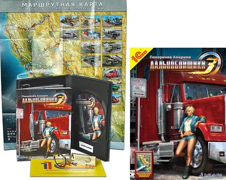 В состав подарочного издания входят: руководство пользователя (на рисунке 1, слева), стальной брелок с надписью «Дальнобойщики 3: Покорение Америки», маршрутная карта, желтая регистрационная карточка пользователя продукции «1С» и DVD-диск с игрой. Под диском напечатан ключ*, который позволит активировать и запустить игру.