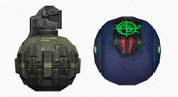 - M9 HE Стандартная осколочная граната USMC,удобная в обращении./T1 APG - Anti-Peronnel-Grenade,это плазменная граната используемая Ковенантами,имеет свойство липнуть к предмету,на которий была брошена,включая пехоту и технику.
