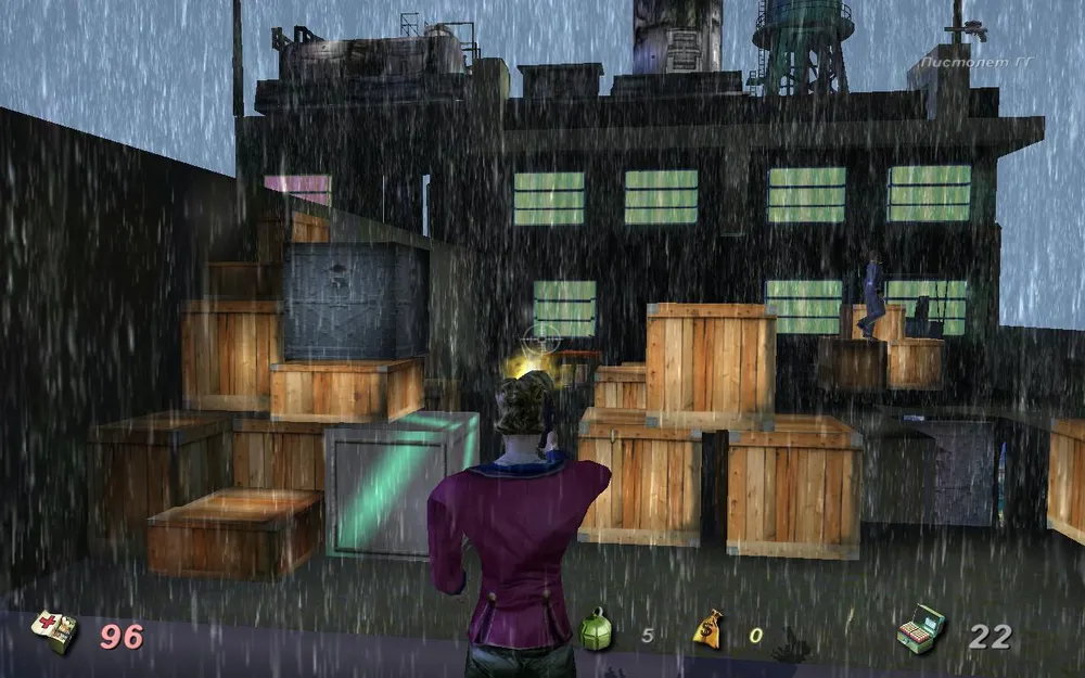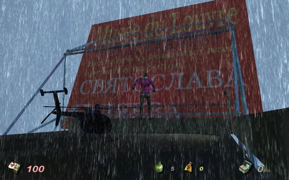 А пока можно наслаждаться невероятной графикой, невиданной человеком. Говорят, где-то за дождем, внезапно исчезающим в двух шагах от героя и огромным биллбоардом о некоем святославе гуляеве, величайшем художнике мира, должен был находиться шутер, сочетающий в себе лучшие черты уже упомянутого Дюка и Tomb Raider. Но, при всей любви к святочке, игрок может получить только истерику.