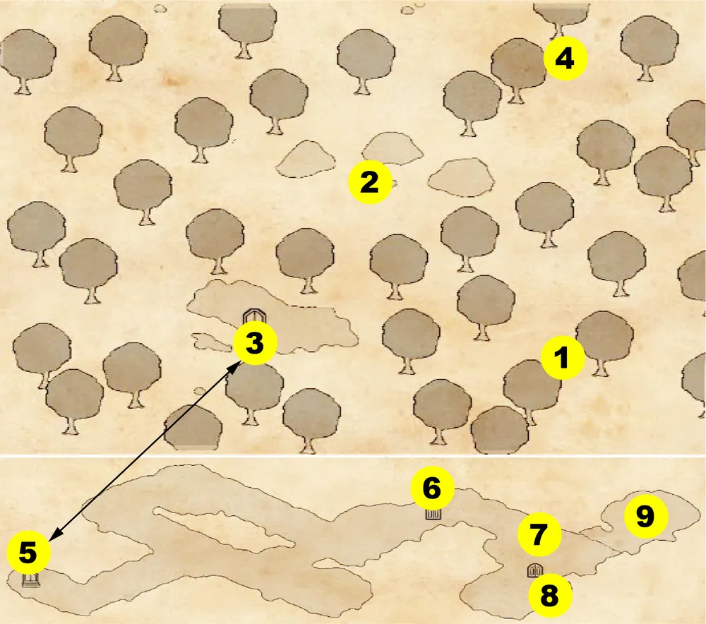 1 – солнечный кристалл. 2 – лук Проклятье Глена Моэрра. 3 – дьявольский корень. 4 – фонтан атрибутов (+2 очка к атрибутам). 5 – фонтан опыта (+5000 ехр). 6 – фонтан атрибутов (+2 очка атрибутов). 7 – фонтан предметов (рандомный предмет). 8 – стол исцеления. 9 – статуя.