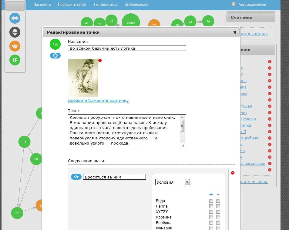 Предметы, проверка на события, да различные счётчики — не такой уж богатый инструментарий, но его хватает. Большинство действий интуитивно понятны и познаются «методом тыка». Правда, если пользователь захочет хотя бы зайти в конструктор что-нибудь проверить/поправить уже после публикации, его железно отправляют на перемодерацию, что невероятно вымораживает.