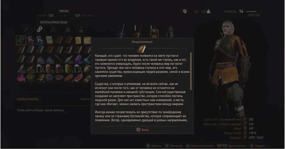 Следующая пасхалка отсылает тоже к Говарду Лавкрафту и его творчеству. В одном из книжных магазинах Новиграда продается книга под названием Некрономикон. Это личное изобретение писателя и его "изобретение" встречается часто во многих его произведениях.