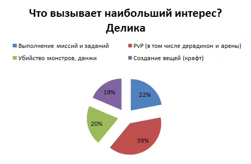 Картина та же, что и на Гардарике - наибольший интерес игроки сервера Делика проявляют к PvP, затем к исследованию мира (выполнение заданий и миссий), на третьем месте - походы в данжи и убийства мобов и только на четвертом - крафт (создание вещей)