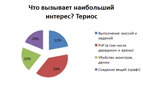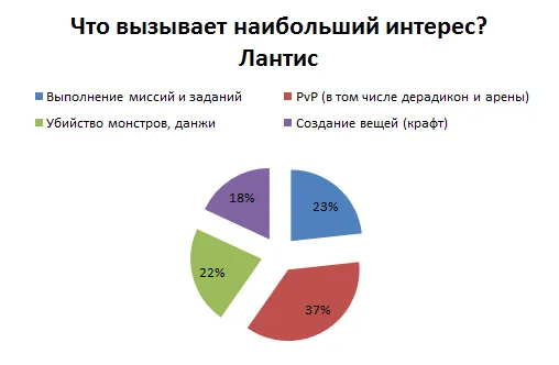 Среди наших игроков очень велик процент тех, кому нравится выполнять миссии и путешествовать по данжам. Кажется, что их меньше, чем тех, кто ставит для себя PvP на первое место..., но если объединить такие пункты, как "выполнение заданий" и "убийство монстров", что, в целом, свойственно направлению PvE, то у нас получится картина равных интересов в проекте (игрокам интересно как PvE, так и PvP).