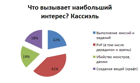 Очевидно сохраняется общая тенденция. Стоит отметить только, что в случае сервера Кассиэль убийство мобов и походы в данжи довольно близко расположилось к наименее популярному крафту. Общий процент заинтересованных в выполнении миссий и заданий для серверов Делика, Гардарика и Кассиэль практически одинаков. То же касается PvP направления.