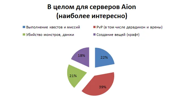 Недавно мы провели небольшое исследование, посвященное интересам игроков в мире Aion. Особенное внимание в нем было уделено PvP направлению. Почему так? На форуме игры с завидным постоянством появляются сообщения «дайте больше PvP!», «хотим PvP». Форум, конечно, не показатель, ведь на нем, как известно, бывает скромный процент игроков, а пишет и того меньше. Но мы решили проверить, действительно ли так много наших игроков интересуется именно PvP? Да и вообще, что больше всего интересует игроков Aion в России? Может, это все-таки походы в данжи? Или крафт?