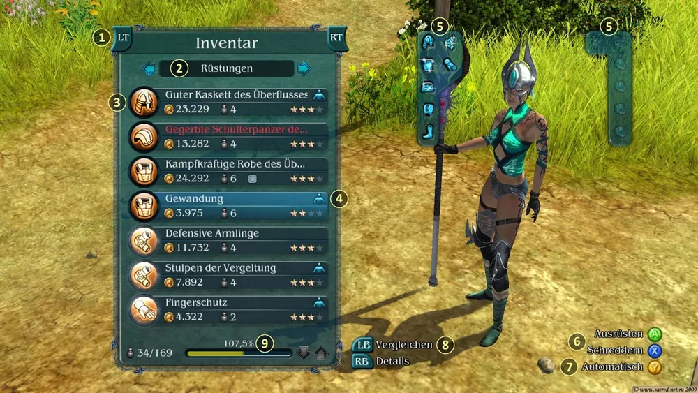 Справа находится герой, в тех доспехах и с тем оружием, что в данный момент используется (обновляется при изменениях). В инвентаре видно, какие части доспеха надеты. Sacred 2 броня разделена по частям тела. Кроме того, если в инвентаре есть какая-то часть доспеха лучше, чем уже имеющаяся, то это будет подсвечено.