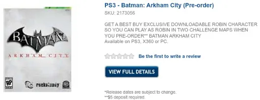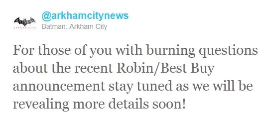 Ай-яй-яй, как же нехорошо обманывать, товарищи разработчики. Кстати, не прошло и дня, как в официальном Twitter'e игры появилась следующая запись: «На все ваши вопросы о Робине/акции Best Buy мы совсем скоро дадим ответы». Вот так вот. Не было, не было соратника у нашего Тёмного Рыцаря, а тут взял, да и появился ни с того ни с сего.