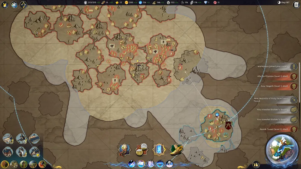 Видимого – нет. Кроме дерева и камней, игроку могут понадобиться другие ресурсы – их находят специально обученные юниты. Каждое здание открывает какое-либо одно, и так – по цепочке. Юниты обучаются в ходе осуществления разведки. Юнит может продвинуться по рангу благодаря случайному событию. Когда жилище юнита улучшается, соответствующий юнит совершенствуется. Тренированные юниты нанимаются в улучшенных жилищах. Новые заклинания игрок изучает, когда его статус удовлетворяет заданным условиям.