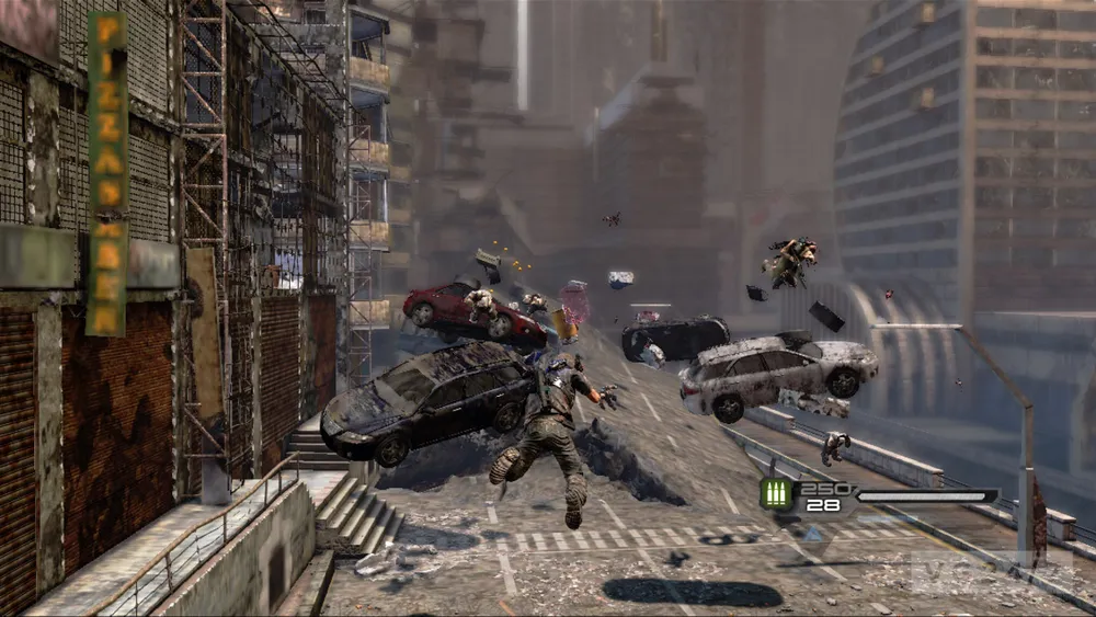 Но и без посильного участия героев мир вокруг ощутимо колбасит. Повсюду гремят землетрясения, образуются масштабные участки, не подверженные гравитации. В такие моменты Inversion пытается изобразить из себя вертикальный шутер в духе Dark Void. Рассел с компаньоном плывут в пространстве от одного мусорного обломка к другому и пытаются выцелить панков. Ожидаемой свободы перемещения в невесомости не получилось. Висящие в воздухе куски чего угодно играют роль «якорей». Отталкиваясь от одного к другому, персонажи постепенно приближаются к очередному земному чекпоинту. Замечу, что перестрелки при нулевой гравитации выглядят небанально, особенно на поздних этапах игры, когда из-за углов начинают выплывать истеричные девки Лутадоров. Вражеская кровь красиво висит в воздухе, когда мы медленно проплываем мимо очередной агрессивной туши. «Ударом» своего Гравилинка Рассел может подогнать себя, но пригождается это умение не слишком часто.