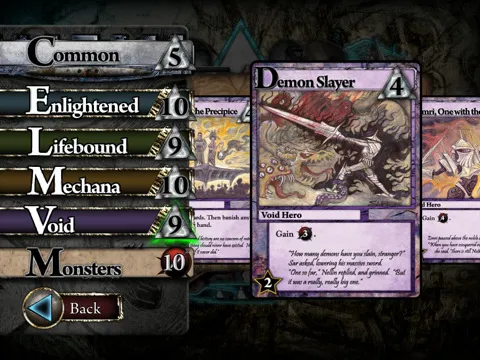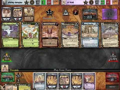 Механика игры довольно проста: у игроков есть колода, в которой имеются боевые и магические ресурсы, а так же заклинания и артефакты, которые в игре зовутся constructs. Структура хода довольно проста, но и отличается от стандартов: игрок может выложить хоть все карты с руки, ибо почти все они дают либо один, либо другой вид ресурсов. Магические, назовем их маной, позволяют утягивать из центральной линии карт себе в колоду то что понравится, а понравится там точно что-нибудь, ибо у карт множество полезных свойств. А боевые - изничтожать чудовищ. Резонный вопрос: "Зачем?". За тем, что победа в игре достигается следующим способом: есть некий пул очков славы.