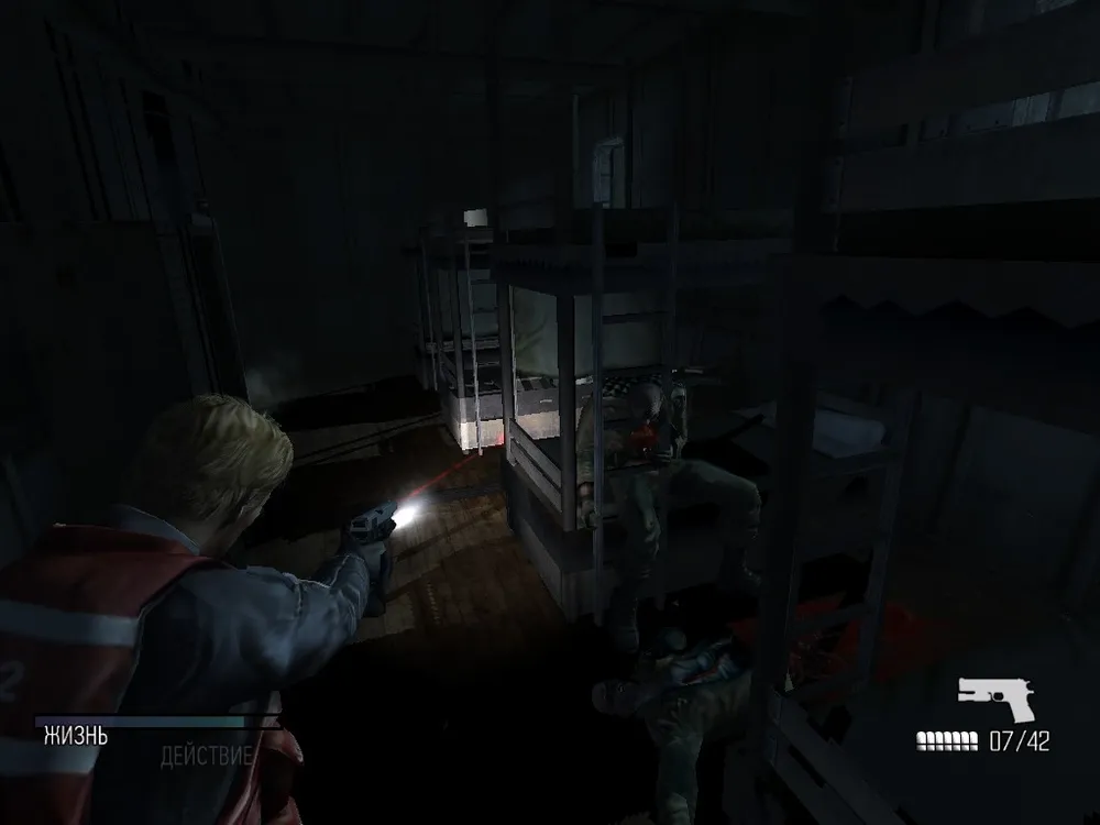 Сложность заключается в том, что дохнут супостаты исключительно после деструкции головного мозга, а прицельной стрельбе дюже мешает ходящее ходуном окружение. Несколько попаданий в торс лишь собьёт врага с ног, успокоив его на время, через несколько секунд передышки, тварь вновь окажется на ногах. Кратковременной потерей сознания зараженных, правда, можно и нужно пользоваться. Наш альтер-эго лихо давит размягченные инфекцией черепа зомби ногой, отправляя восставших из небытия к праотцам окончательно. Но нога в данном случае тоже не панацея – подобная тактика чревата излишней тратой драгоценных патронов, которые на высоком уровне сложности на вес героина.