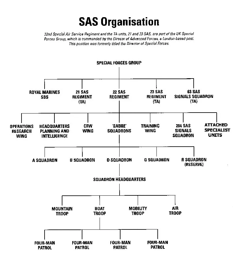 Обычно солдаты и офицеры после первичного отбора в SAS проводят около пяти месяцев в обучении (жесточайший курс отбора в подразделение, который занимает 45 суток, уже стал отдельной легендой), включая получение медицинских навыков, организации засад и проч. Их распределяют по четырем эскадронам (A, B, C, D.) – обычно на два года. Каждый эскадрон, в свою очередь, состоит из штаба и четырех подразделений (аналог нашей роты), а подразделение — из четырех патрульных групп по четыре человека в каждой (основное боевое звено полка). Роты имеют свою специализацию. Одна предназначена для действий в горной местности, другая — на специальных средствах движения, третья выводится в тыл противника воздушным путем, четвертая — морским. Потом бойцы могут перейти в тренировочное крыло, или в более специализированные подразделения SAS.