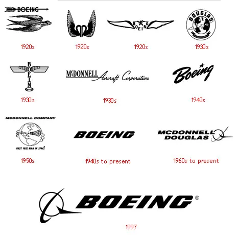 В логотипе авиастроителей Boeing не единожды побывало все, что так или иначе касается полетов,взлетов,вылетов,залетов, сменяя друг друга - птички, крылья, опять крылья, земной шар, опять крылья, звезда и еще раз земной шар. В итоге в 1997 году Boeing остановился на схематическом изображении земного шара и схематическом же изображении крыльев справа внизу.