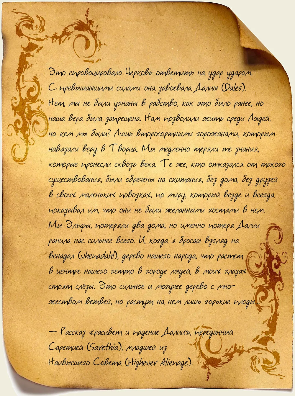Мы Эльфы, потеряли два дома, но именно потеря Далии ранила нас сильнее всего. И когда я бросаю взгляд на венадал (vhenadahl), дерево нашего народа, что растет в центре нашего гетто в городе людей… в моих глазах стоят слезы. Это сильное и могучее дерево с множеством ветвей, но растут на нем лишь горькие плоды…