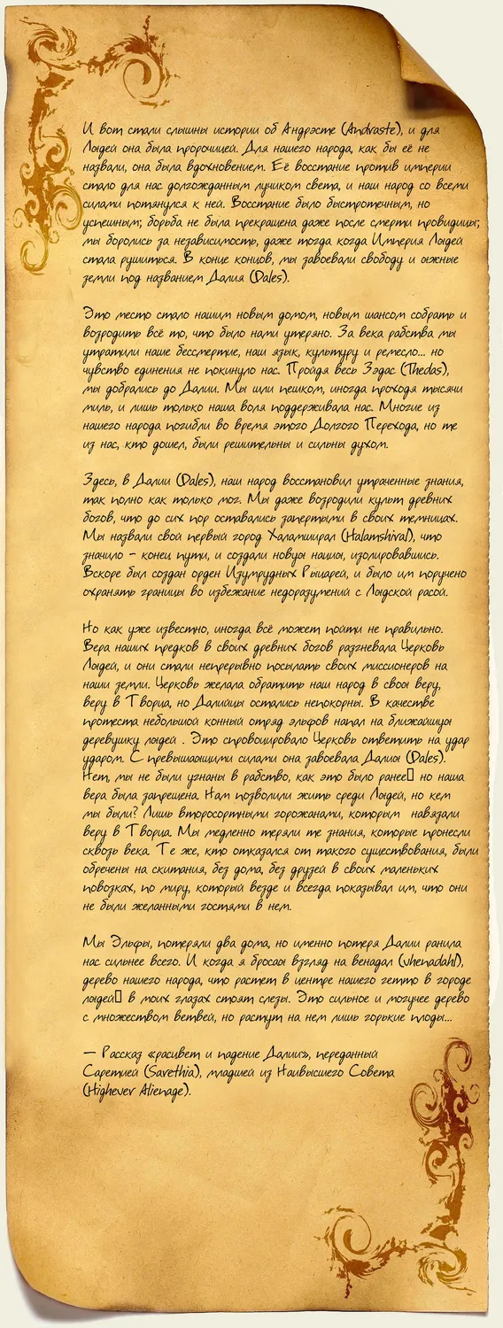 Но как уже известно, иногда всё может пойти не правильно. Вера наших предков в своих древних богов разгневала Церковь Людей, и они стали непрерывно посылать своих миссионеров на наши земли. Церковь желала обратить наш народ в свою веру, веру в Творца, но Далийцы остались непокорны. В качестве протеста небольшой конный отряд эльфов напал на ближайшую деревушку людей . Это спровоцировало Церковь ответить на удар ударом. С превышающими силами она завоевала Далию (Dales). Нет, мы не были угнаны в рабство, как это было ранее… но наша вера была запрещена. Нам позволили жить среди Людей, но кем мы были? Лишь второсортными горожанами, которым навязали веру в Творца. Мы медленно теряли те знания, которые пронесли сквозь века. Те же, кто отказался от такого существования, были обречены на скитания, без дома, без друзей в своих маленьких повозках, по миру, который везде и всегда показывал им, что они не были желанными гостями в нем.