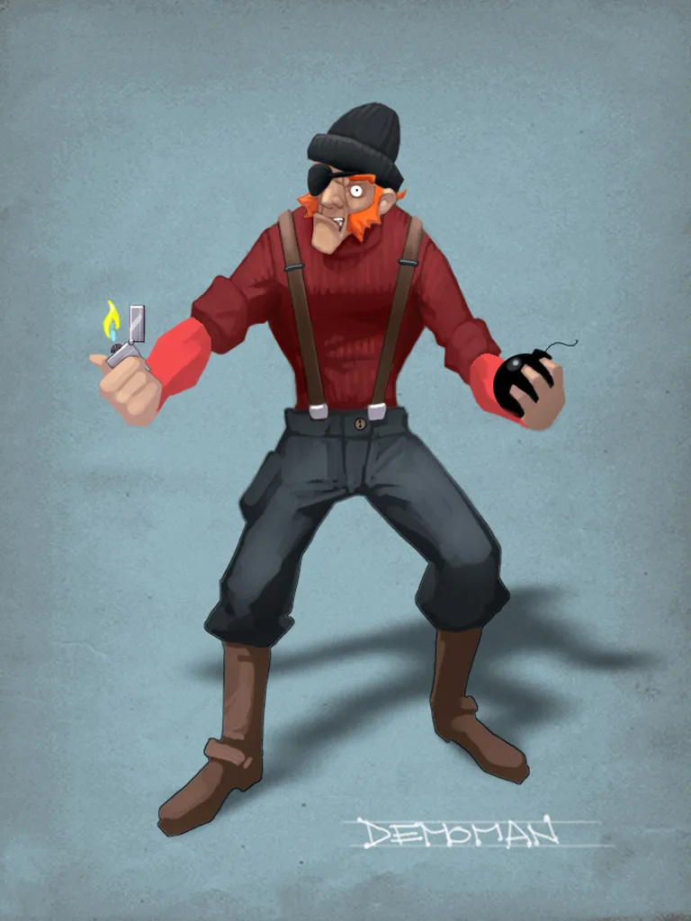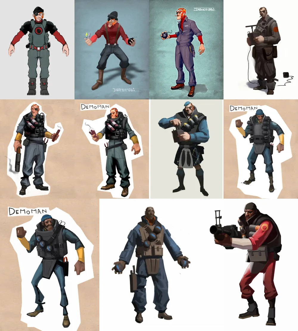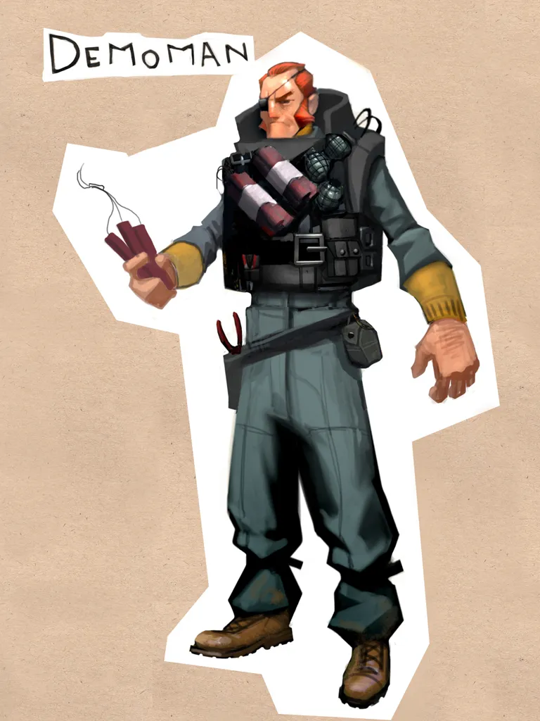 Первоначально Подрывника хотели сделать белым как и всех Персонажей игры и первоначально он и вправду походил на насоящего Шотландца - рыжие волосы и выраженная Шотландская внешность. Тогда экипировка была даже приблизительно непохожа на то что сейчас надето на Подрывника: