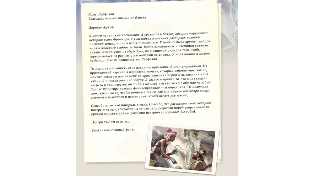 С тех самых пор вся ее жизнь посвящена заботе о других, а в Играх Apex она участвует, чтобы выиграть средства для Корпуса Фронтира и помогать пострадавшим в войне. Так она пытается искупить вину за то, что совершили ее родители. А вот письмо от ее преданного фаната, которого она когда-то спасла от верной гибели: