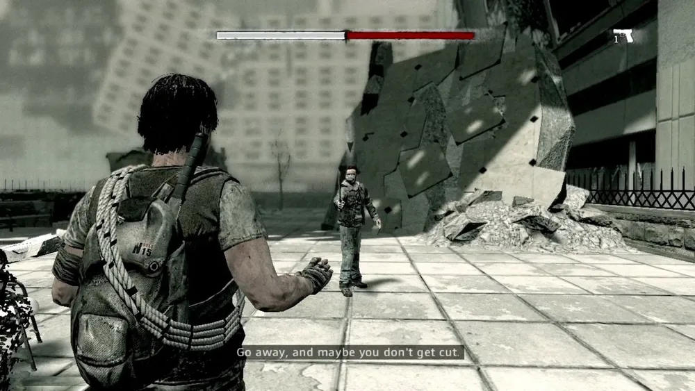 Разработчики умудрились создать настолько густую атмосферу депрессии, на сколько это вообще возможно в играх. Честно скажу: я нигде не видел подобного. Постоянная серая гамма угнетает, это ощущение УЖЕ наступившего конца подогревается депрессивной музыкой и впечатляющими видами разрушенных городов, мелочами, вроде пыльной палатки и детского скелетика, обнимающего плюшевого мишку рядом с надписью "Нужна вода" на куске картона... И, путешествуя по руинам, за каждый угол заглядываешь с опаской - не выскочит ли оттуда жуткий монстр с мачете в руках и желанием отобрать все твои запасы, а то и тебя приготовить на ужин. Все встречные люди делятся на сюжетных персонажей (например, маленькая девочка, которую герой спасает от банды); врагов и потенциальных врагов (не каждый встречный будет пытаться убить героя) и людей, которым нужна помощь, вроде лекарств или еще чего-нибудь. В последнем случае герой сталкивается со сложным выбором - поделиться скудными запасами или проигнорировать просьбу о помощи. Правда великодушие вознаграждается сполна - герою дается дополнительная "жизнь" - если он умрет, то начнет не с начала текущей главы, а ближе к месту гибели.