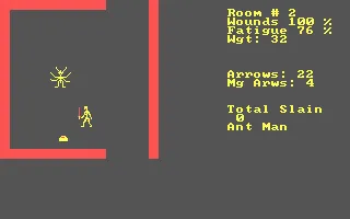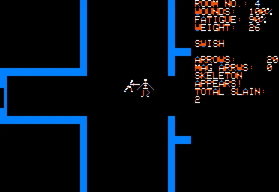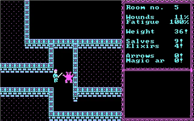 Боевая механика была довольно проста. Встретив монстра, игрок мог атаковать, толкнуть, парировать или выстрелить из лука. Перемещение и атаки расходовали усталость (Fatique), а вместо хит-поинтов отображался уровень ранений (Wounds). Дополнительные способности позволяли искать ловушки и скрытые двери, пить зелья, а также уговаривать монстров вас пропустить.