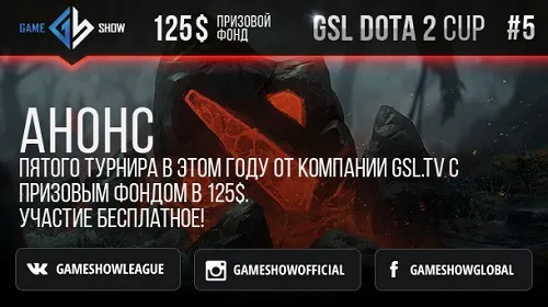 Приглашаем принять участие в GSL DOTA CUP #5, который состоится 9 февраля (19:00 по МСК). Призовой фонд составит 125$! Регистрация доступна по ссылке. Участие бесплатное!