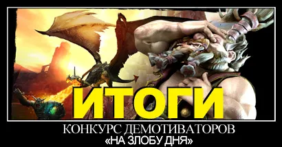 Дамы и господа! Конкурс демотиваторов «На злобу дня» - по крайней мере, в его нынешнем виде – завершен. Нет нужды говорить об успехе, вы и сами прекрасно знаете, что на конкурс было подано огромное количество работ, многие из которых вполне могли претендовать на призы. После долгих и мучительных размышлений администрация выбрала победителей: 646R, Noobolom, Sergio_93 и Ztnv. Каждый из них получит по 300 кристаллов, а 646R – аж 600, потому что среди лучших творений оказалось целых два его шедевра. Мы решили не прекращать конкурс. «На злобу дня» теперь переедет с форума в официальную группу ВКонтакте: там будет создан специальный альбом, в который любой желающий сможет добавлять свои демотиваторы. Каждую неделю мы будем выбирать самый актуальный, злободневный и остроумный из них, а его автора награждать сотней кристаллов. Так что не прекращайте творить, все еще только начинается!
