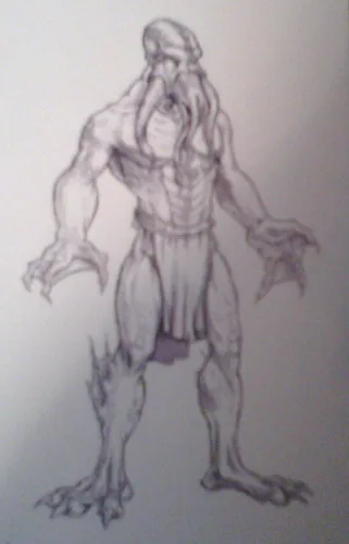 Юбка, грубо сплетённая из обрывков кожи. На трёхпалых лапах металлические массивные перчатки. На лбу круглая метка красного цвета.