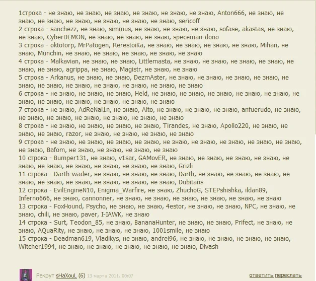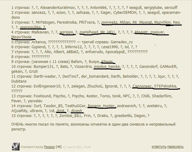 1 строчка: не знаю, Вася, Лось, Даша, не знаю, не знаю, Сивый, не знаю, Чучундра и так далее.