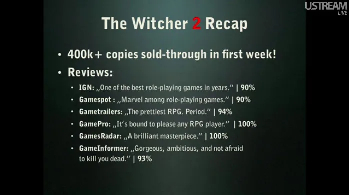 За первую неделю продаж Ведьмак 2 продался тиражом свыше 400 тыс. копий, а также получил множество лестных отзывов прессы и игроков.