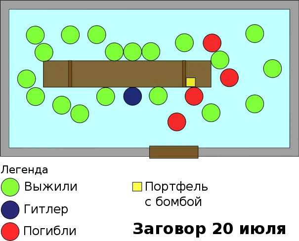 Чтобы лучше контролировать фюрера, Штауффенберг сел справа от него. Что же, вроде всё в порядке? Пока докладывали о ситуации на Восточном фронте, полковник поставил портфель на стол поближе к Гитлеру и за 5 минут до взрыва покинул помещение.