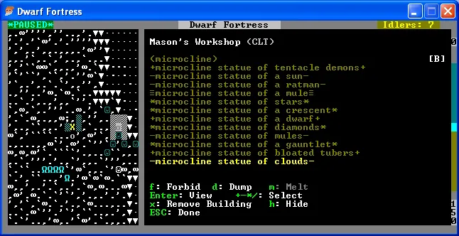 Сегодня Toady One выложил скриншот новой версии, показывающий производство статуй в Mason's Workshop. Теперь можно сразу увидеть что изображает та или иная статуя, и выбирать нужные для создания например тематического сада. То же самое применимо к фигуркам (figurines). Список изображений пока предварительный.