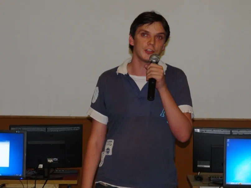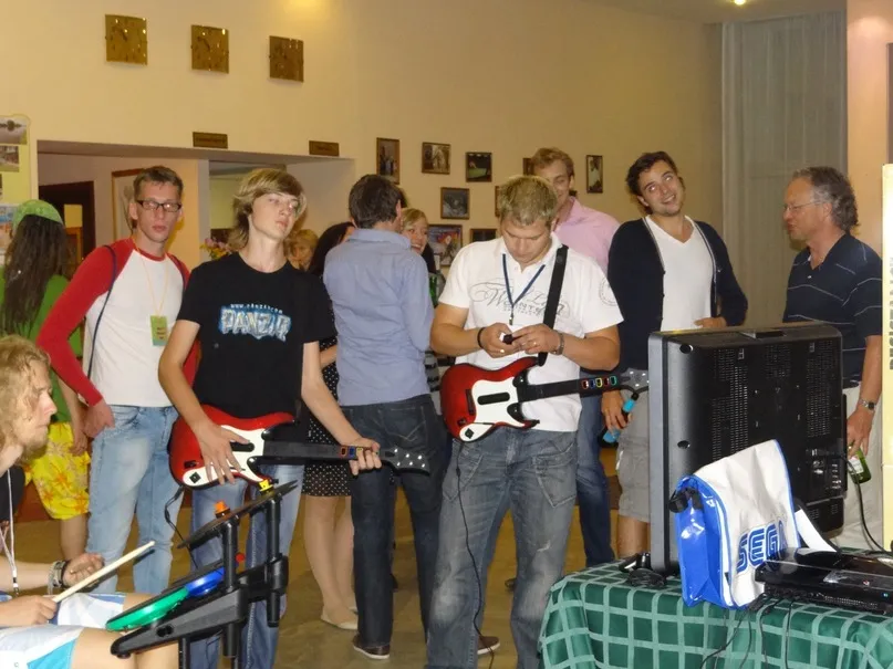 На поздний вечер мы договорились с уже приехавшими разработчиками на встречу в актовом зале, где они налаживали игру. И вот, взяв пироги и собравшись спускаться вниз, мы услышали дикий вопль "Пожар!!! Все вниз!!!". Серьезно мы его не восприняли, но все-таки сбежали вниз. Оказывается, всем желающим предложили сыграть в Зарницу. Постояв полминуты у сцены, мы дружно решили, что лучше все-таки покушать пироги с разработчиками, и направились прямиком в актовый зал. Где-то часа полтора мы знакомились, болтали, задавали вопросы и пр. Именно с того момента фраза Николая "Геймдев таков" навсегда отпечаталась в нашей памяти, равно как и он сам. Наши посиделки закончились довольно неожиданно - запахло паленым от проводов, отрубились компы, раздался крик "Туши!". Кроме нерабочих розеток результатом оказалась потеря данных, из-за которой в актовом зале потом всю ночь кипела работа...