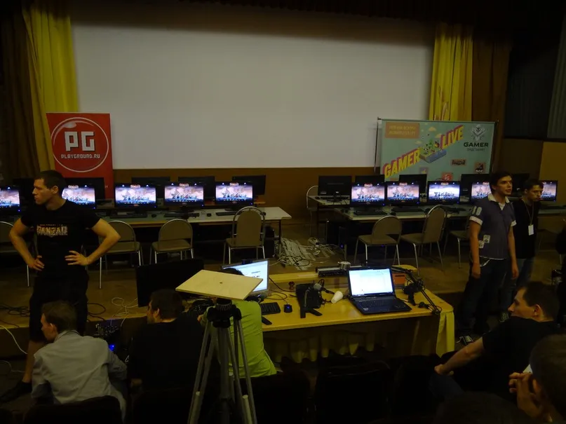 Тут у меня начинается буря эмоций... 20 компов, стоящих на сцене, стрим, комментаторы, зрители, нервы, адреналин...Единственное чего не хватало - так это трансляции турнира через проектор. Пришлось вглядываться в экраны игроков и слушать комментатора. Никаких лагов, дисконнектов, глюков - все было очень круто. Самой эпичной битвой стало сражение между AMD и Gamer.ru.