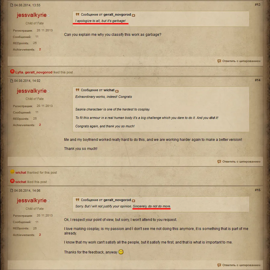 На мой взгляд и вкус, менее всех с моделью повезло Цири. Но даже ее косплей стоит признать зачетным по сравнению с тем, что порой встречается не просто в сети, а на официальном форуме Проектов. Чуть ли не одновременно с объявлением конкурса некая jessvalkyrie рискнула поделиться с сообществом своей трактовкой образа предводительницы вергенской республики. Сообщество, включая представителей CD Projekt, восторженно взвизгнуло и принялось дружно нахваливать работу неожиданно объявившейся косплеерши. Только один честный человек отважился назвать вещи своими именами, попросил девушку больше так не делать, но остался непонятым. Ох уж эта чрезмерная западная толерантность и политкорректность. А косплей тот, и правда, был зело ужасен не ахти какой.