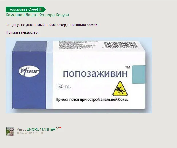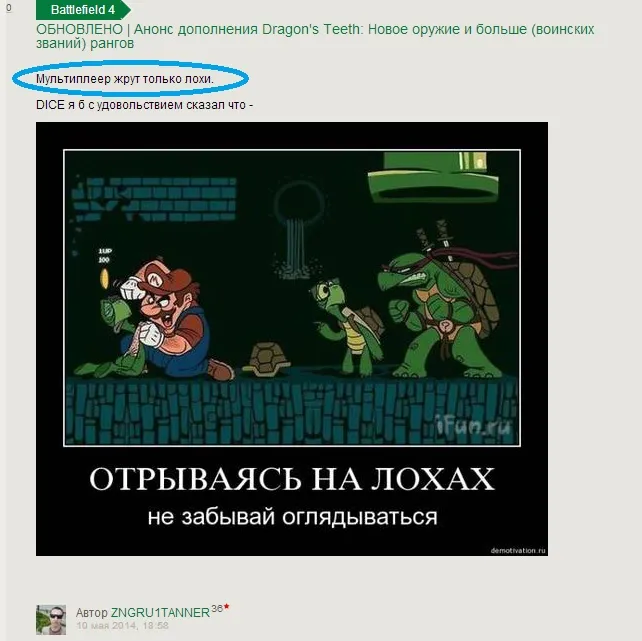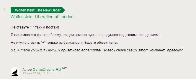 Вот именно по этой причине у меня "пару" раз возникали вопросы с ZNGRU1TANNER. Я пытался его образумить от "загаживания" своими постами сайт, а также отмечал его неуравновешенность в отношении многих геймеров, которых он оскорблял только потому-что определенный жанр игр ему не нравится, а те кто в него играю, мягко говоря глупцы.