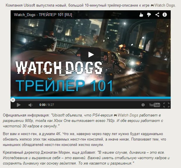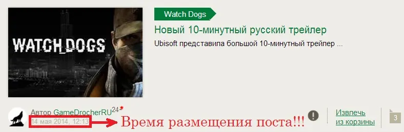 Сегодня я, 14.05.2014 в 12:13 разместил свой пост "Новый 10-минутный русский трейлер" на странице игры Watch Dogs.