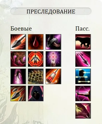 Первая из них - «Преследование». Способности этой ветки рассчитаны на повышение эффективности ваших атак дальнего боя: увеличиваются урон, радиус стрельбы и скорость перемещения вашего персонажа. Помимо этого, на цель вешаются такие эффекты как замедление, кровотечение, обезоруживание и обездвиживание. Эта ветка — основная для сильного RDD.