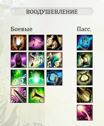 Вторая "укрепляющая" специализация (мы посовещались и решили) это «Воодушевление». Помимо того, что ее способности, опять же, превосходно комбятся сами с собой, накладываются эффекты ужаса, замедления и оглушения. Прок веткам «Оборона», «Мистицизм», «Преследование» и «Скрытность» - в качестве возможности запуска комбо. Польза всем в принципе — в виде понижения брони и урона вражеских бойцов, масс-хиле или поднятии сбитых с ног соратников. Ветка «Воодушевление» очень важна для тех, кто хотел бы попробовать себя в роли Барда, это очень востребованный в массовом PvP класс.