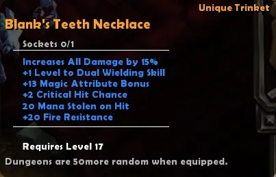 - Blank's Teeth Necklace - уникальное ожерелье дающее хороший бонус ко всему урону и еще несколько случайных эффектов (имеет дополнительное свойство: Dungeons are 50more random when equipped.)