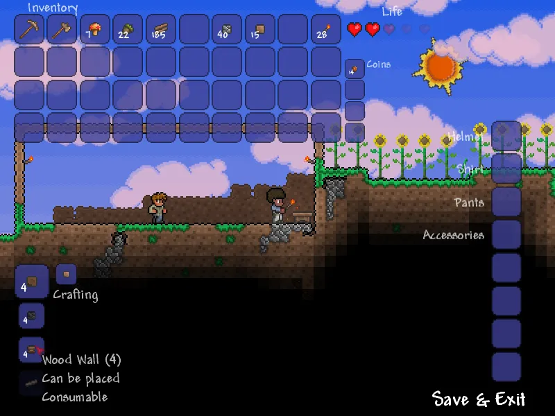 Солнце уже заходит, а мы совсем забыли про заднюю стену. Крафтим деревянную стену (Wood Wall) и устанавливаем ее – кликаем по «фону» нашего дома, аккуратно закрывая все пространство – в комнате с земляными стенами могут появляться враги, пока вас нет дома. Мешает задняя стена из земли, из-за того, что сравняли с землей мешающий холм? Поможет молот (Wooden Hammer) – крафтим его из дерева и применяем на нужных местах. Молотом также можно снести криво поставленные стены или убрать установленную в доме мебель. Снос задней стены может занять некоторое время… Если вы не собираетесь выходить до утра из дому, можно оставить это на потом.