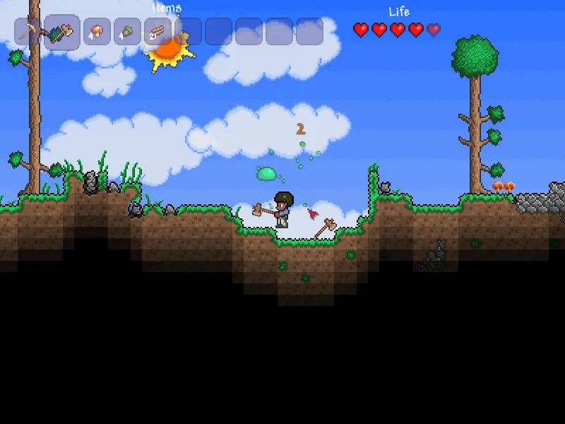 Осмотримся вокруг – тут у нас заросли подсолнухов, там заросли грибов, дальше небольшая роща. В грибника и садовода играть будем потом, а сначала направимся к деревьям. В этой игре нельзя рубить деревья руками и делать деревянные кирки! =) Поэтому первые два слота у нас уже заняты медной киркой (Copper Pick) и медным топором (Copper Axe). Не успели мы подойти к дереву, а навстречу уже прыгает что-то круглое и студенистое. Это разноцветные слизни (Slime), их тут много. Считайте, что это местный Creeper, только кавайный и не взрывается. Зато их больше, гораздо больше криперов… Отбиваться лучше киркой, а не топором.