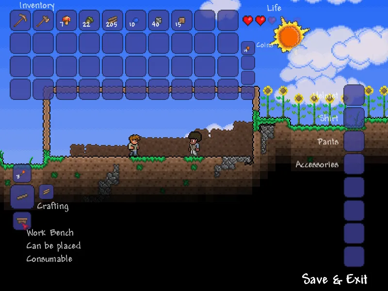 Строить дом можно сразу из дерева, но мы, передавая привет Minecraft, накопаем немного грязи (Dirt) для стен – дешево и быстро для первой ночи, а потом можно построить хоть каменный форт. Активируем кирку (не забываем про горячие клавиши!) и копаем себе строительный материал – для начала хватит 50 единиц. Заодно можно расчистить площадку для первого домика, если не нашлось достаточно ровного места. Активируем слот с блоками земли и строим две стены, не слишком далеко друг от друга, а также крышу – тут есть и летающие враги (блоки можно класть в прыжке). Убежище готово? Не совсем, мы забыли про третью стену!