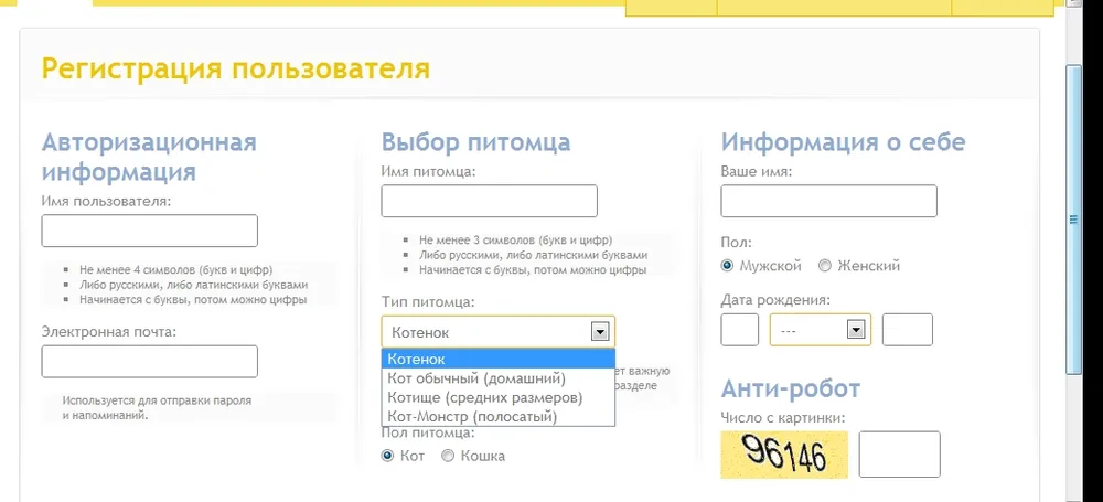 Регистрируемся.Казалось бы обычные поля,но привлекает внимание выбор типа кота:
