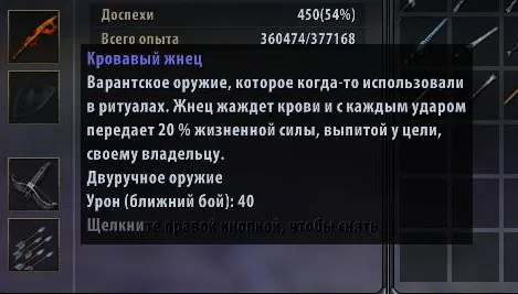 А затем до самого конца игры, примерно с половины, прошёл с Кровавым Жнецом – двуручник, 20% отнятой у врагов жизни дарует носителю, тем восстанавливая красную полосочку. Урон его – 40 (где нашёл – не помню..).
