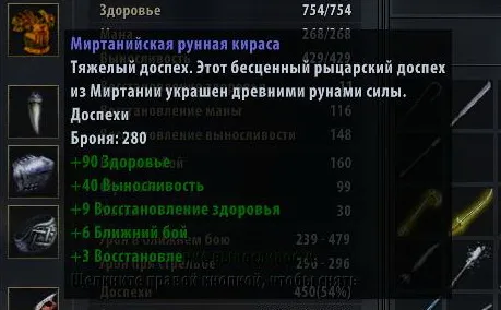 Броня: Всякие разные красивые жакеты – начиная от жилетки, что с барского плеча подаровал Диега, и заканчивая Миртанийской рунной кирасой, которая даёт 280 защиты + усовершенствования